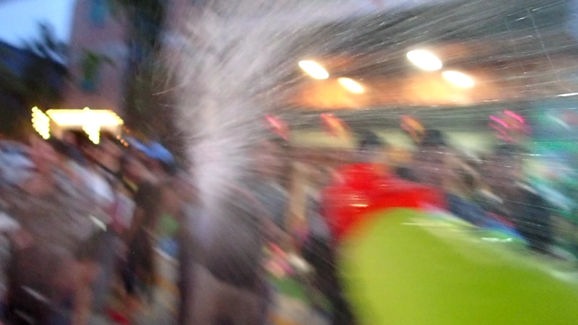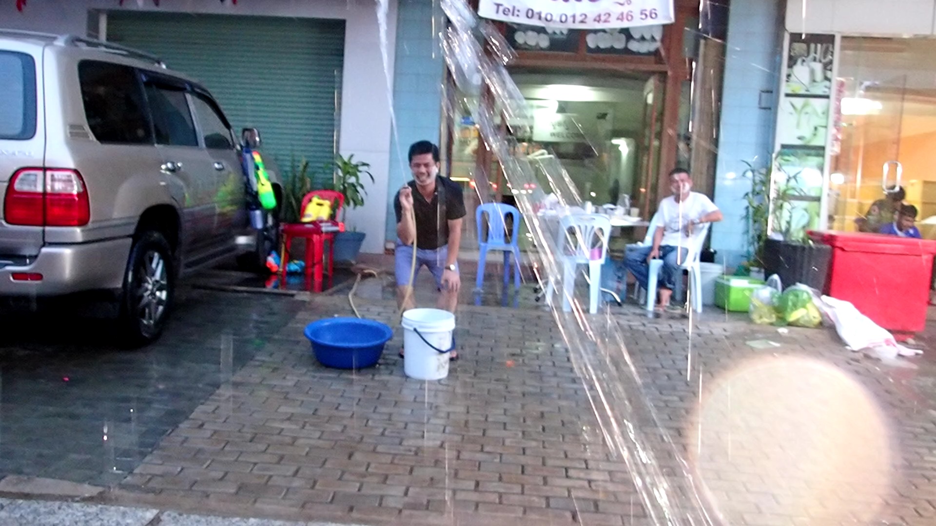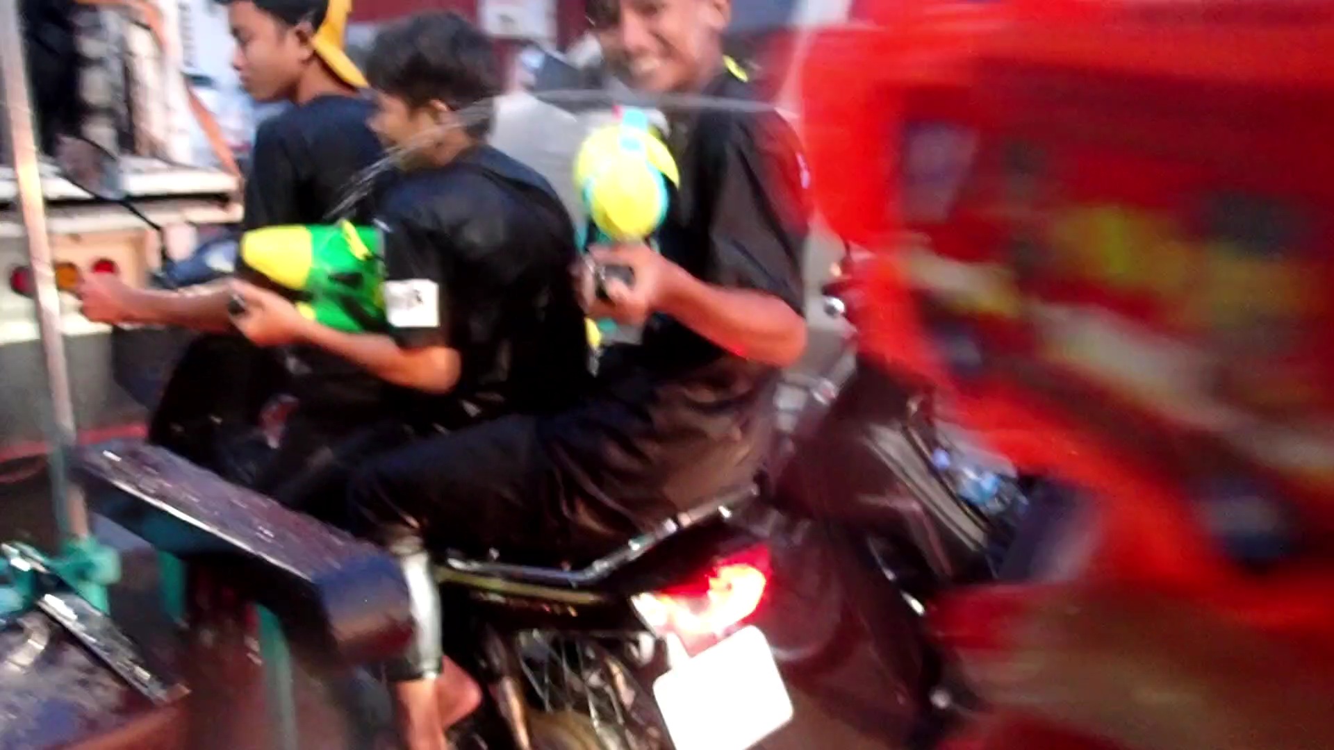 Als ich später zum Abendessen einen Tuktuk-Fahrer am Hotel bat mich die 10 Minuten in die Stadt zu fahren, fragte er erstmals, ob all meine Sachen nass werden dürften, und ich dachte an spielende Kinder. Von wegen! Der Songkran hatte hier heute sein großen Abschlussfest! Je näher wir der Stadt kamen, umso nasser wurde es! Mein Tuktuk-Fahrer hielt an und organisierte mir erstmal am Straßenrand eine Wasserpistole, ich solle auch vorbereitet sein! Ich freute mich maßlos und dann begann der Spaß…Eimer, Schüsseln, Wasserschläuche, riesige Fässer…da waren Wasserpistolen nichts gegen! Es fuhren riesige Auto, Tuktuk, Motorrad, Fahrrad-Konvois durch die Stadt, beladen mit allen möglichen Wasserbehältern! Mir wurden Schüsseln übergeschüttet, Wasserschläuche in den Tuktuk gehalten, aber ich schoss mit meiner kleinen Wasserpistole zurück! Damit rechnete wohl niemand, und wir kamen alle aus dem Lachen nicht mehr raus! Ich kann mich nicht erinnern, dass ich fast zwei Stunden am Stück so herzhaft gelacht habe! Ich rechnete bereits damit, mir irgendwo was zu Essen auf die Hand mitnehmen zu müssen. Alles war ja nass, auch die Sitzgelegenheiten aller Restaurants, daher: herzlich willkommen! Nach dem Essen bin ich die paar Meter weiter in dem Herzstück der Stadt angekommen. Unglaublich! Das sollte man definitiv erlebt haben! Tausende Menschen, alle klitschnass, aber alle bekleidet, da der Songkran ein heiliges Fest ist, und die Schultern bedeckt sein müssen. So eine unbeschreiblich ausgelassene, lustige, fröhliche Stimmung, jeder beschoss jeden. Und wenn man merkte, dass meine Pistole kein Wasser mehr hatte, wurde sie mir entrissen und gefüllt! Ich bin ja von vielen Orten und Geschehnissen begeistert, aber das hier steht fest: ich komme wieder!